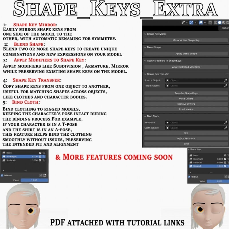 The Shape Keys Extra addon is designed to give Blender users powerful new tools to manage and manipulate shape keys with ease. Whether you’re looking to mirror shape keys, blend them to create unique expressions, apply modifiers without losing shape key data, transfer shape keys between objects, or bind clothing to rigged models in different poses, this addon has you covered!